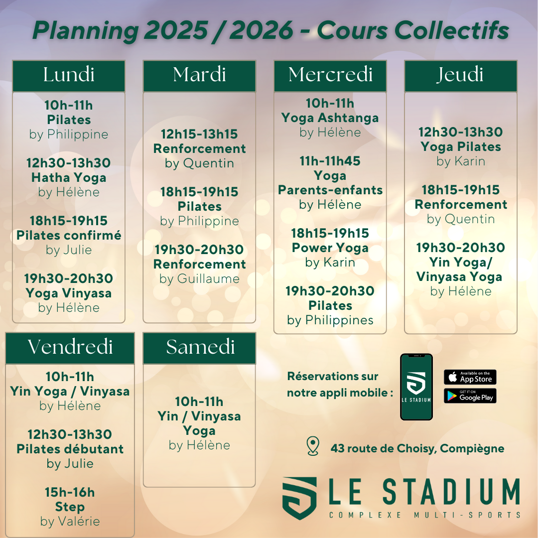 Envie de faire du sport ? Participe à nos cours collectifs : Yoga (Hatha, Vinyasa & Power), Pilates, Renfo, Steps, Zumba... il y en a pour tous les goûts !